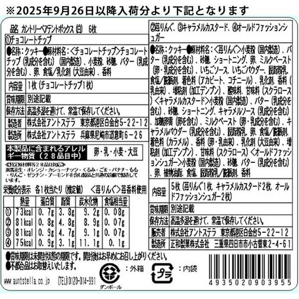 ・内容:クッキー 6枚(チョコレートチップ 1枚、苺りんぐ 1枚(※苺香料使用)、キャラメルカスタード 2枚、オールドファッションシュガー 2枚)