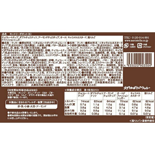・内容:クッキー 1枚×12袋(チョコレートチップ、ダブルチョコナッツ、アーモンドチョコチップ、オールドファッションシュガー、キャラメルカスタード、苺りんぐ(※苺香料使用) 各2枚)